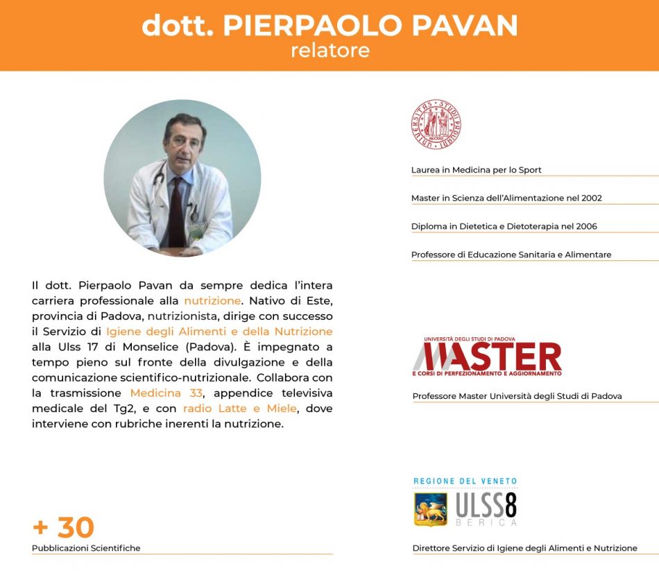 Pierpaolo Pavan è un nutrizionista di fama internazionale, nonché direttore del Servizio Igiene degli Alimenti e della Nutrizione dell'Ulss 8 Berica. Docente all'Università degli Studi di Padova in Educazione Sanitaria e Alimentare, ristorazione collettiva e organizzazione.
